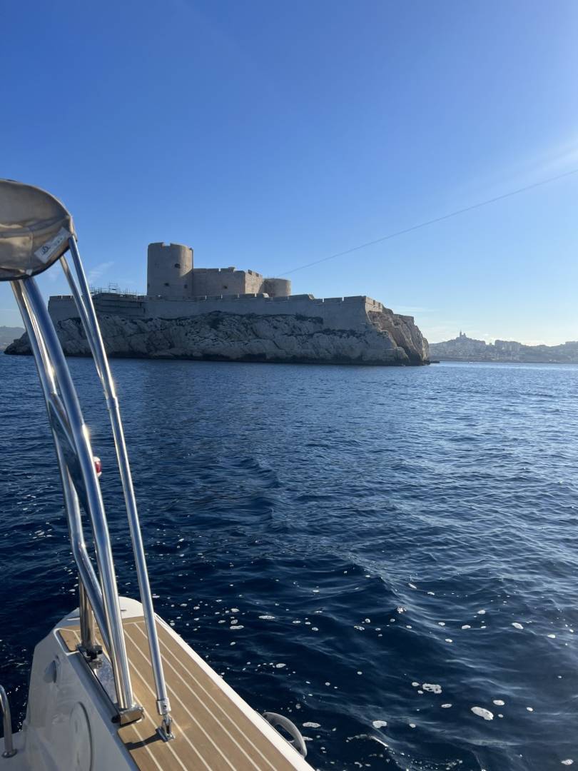 Vue sur l’Île du Château d’If – Découvrez l’île célèbre pour avoir inspiré Alexandre Dumas dans le « Comte de Monte-Cristo » avec une explication historique de votre capitaine.